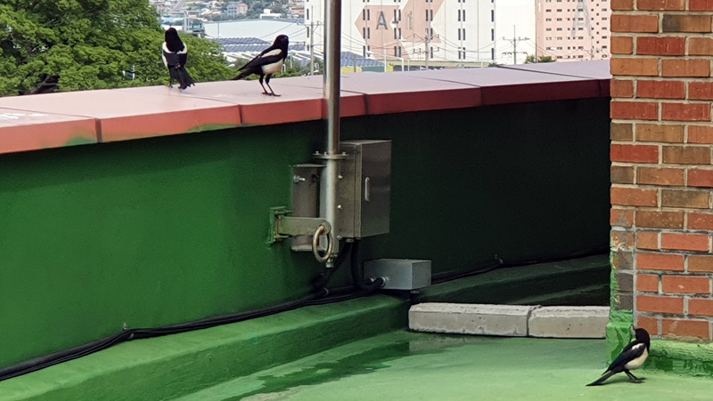 사람이 있는곳은 보통 새들은 안들어오는데 호기심이 많은 애기까치인듯 하다.